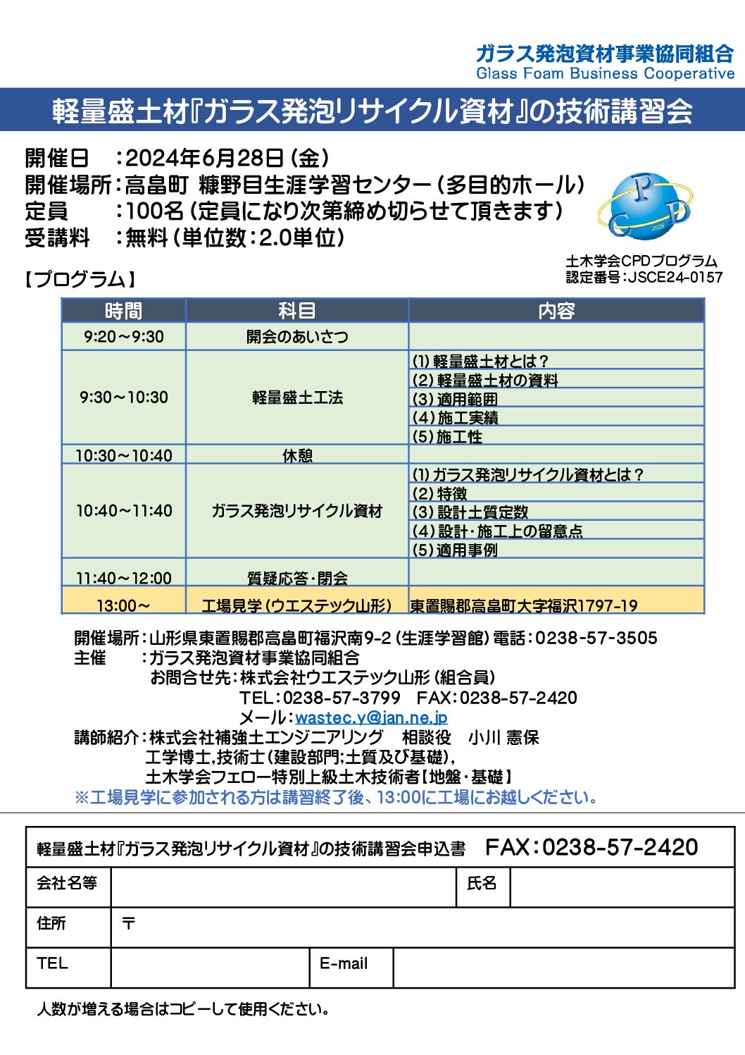 2024/06/24 2024年6月28日開催 ガラス発泡リサイクル資材技術講習会開催のお知らせ【山形県】 2024年6月28日(金)、山形県高畠町にて「軽量盛土材『ガラス発泡リサイクル資材』の技術講習会」が土木学会のCPD認定プログラム(2.0単位)として開催されます。先着100名様となっておりますので、お申し込みはお早めにお願い致します。詳細、申込については添付ファイルを参照ください。 >イベント情報一覧はこちら « ゴールデンウイーク休業日のお知らせ 技術講習会開催のお知らせ【香川県】 »